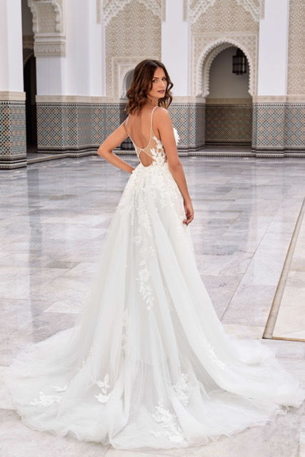 Keyhole back with thin beaded strap, A-line skirt with front split, sparkle underlay & lace applique detail